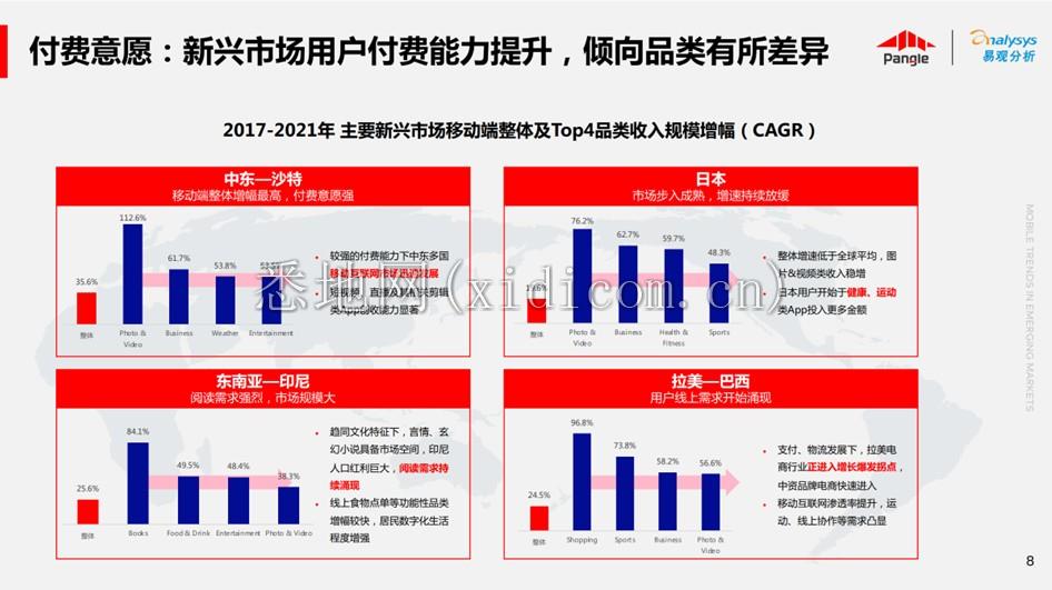 同时,新兴市场虽然具备快速发展、需求旺盛的共性,但在用户使用及付费习惯、倾向内容层面仍有很大异同。以各区域主要国家的品类为例:如中东地区,基于文化背景等特殊因素的影响,其地区各国娱乐产品发展受到一定限制,随着娱乐社交、短视频+直播概念的兴起,用户娱乐需求得以释放,以图片/视频剪辑、滤镜添加为主要功能的App开始兴起,相关品类收入规模同比增长突破112.6%。同样,在中译小说和国内作家运营经验输出所打造的当地原创小说的共同作用下,小说APP打开了东南亚地区市场,图书品类收入同比增长84.1%;线下物流的搭建、中国电商经验的输出下,巴西用户线上购物需求得到进一步挖掘,电商品类收入同比增长96.8%。