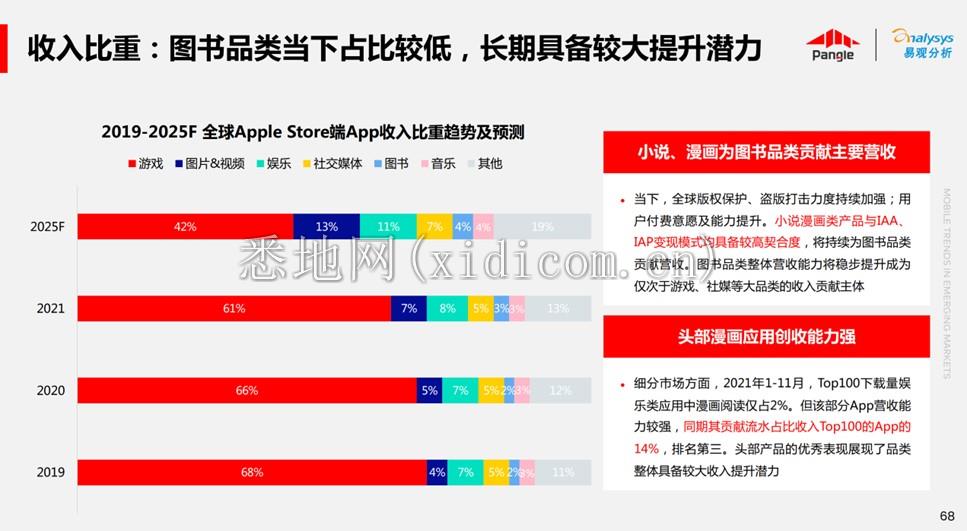 随着全球范围内打击盗版力度的加强,正版IP内容逐步回归头部平台。相较其他品类,IAA变现模式与图书品类中的小说漫画类App高度契合,未来头部IP聚集App将具备更强的用户粘性。结合有功能界限的展示策略和稳定的广告填充,该品类收入于整体移动端占比将逐步提升。