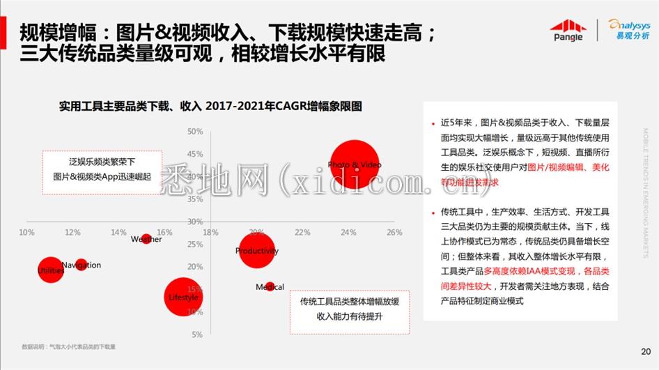 结合近4年来,实用工具中主要品类的下载量增幅(横向)、收入增幅(纵向)及下载量规模(气泡大小)来看,图/视频剪辑类(Photo & Video)用户需求迸发。截至2021年,其品类下App总下载量突破233.7亿次,仅次于移动游戏;收入突破160.4亿美元,仅次于游戏、社媒和娱乐品类,成为近年来快速发展的朝阳品类。