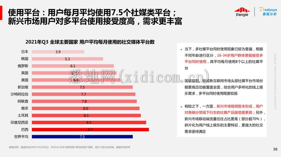 截至2021年第三季度,全球平均用户每月打开的社媒平台为7.5个,新兴市场则多为8个及以上,拉高了人均社媒平台数量;全球用户平均单日使用社媒平台市场突破2小时27分钟,巴西、墨西哥等地则均突破了3小时。