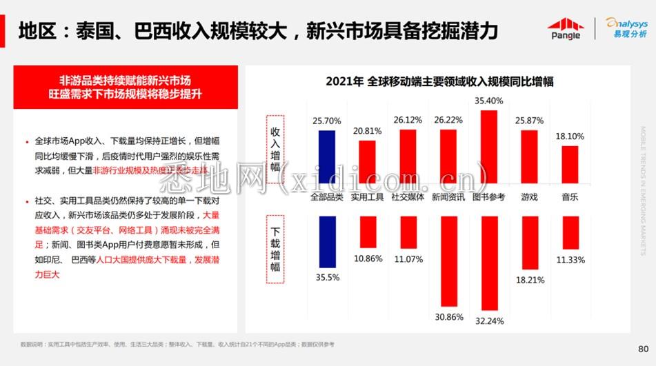 着眼移动端,截至2021年,全球移动用户支出突破1700亿美元,同比增加18.8%;用户单日通过移动设备的上网时长突破6小时20分,同比增长约1%,其中,新兴市场为移动端数据增长的主要贡献方。以用户支出为例,如沙特阿拉伯、土耳其2021年用户移动端支出同比增长分别达31.5、31.4%,远高于全球平均水平(18.8%),泰国、巴西同比增幅也分别在20%以上。用户单日使用时长方面,以巴西为例,其移动端用户单日网络使用时长超过10小时,东南亚如印尼等国家同样超过9小时。新兴市场中高速增长的移动端网民数量,贡献了庞大的收入及下载量。