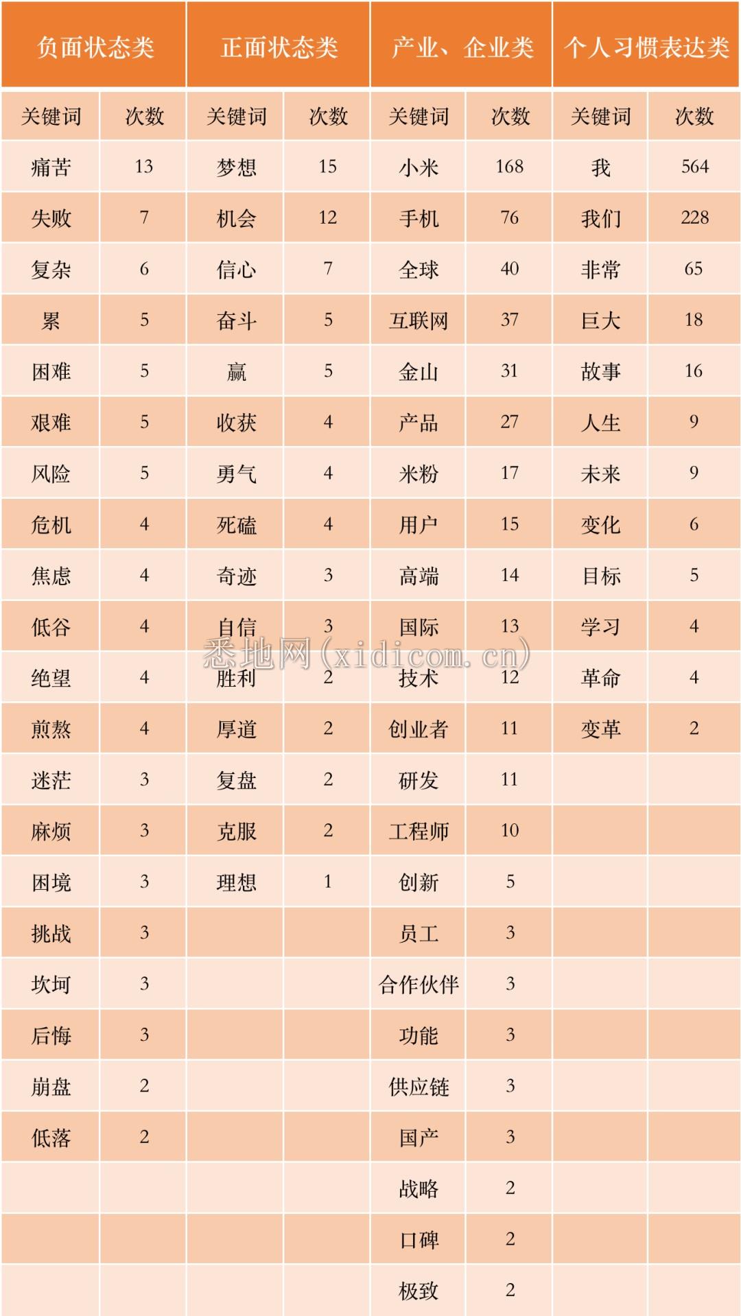 雷军演讲中出现的四类关键词。制表:姚赟