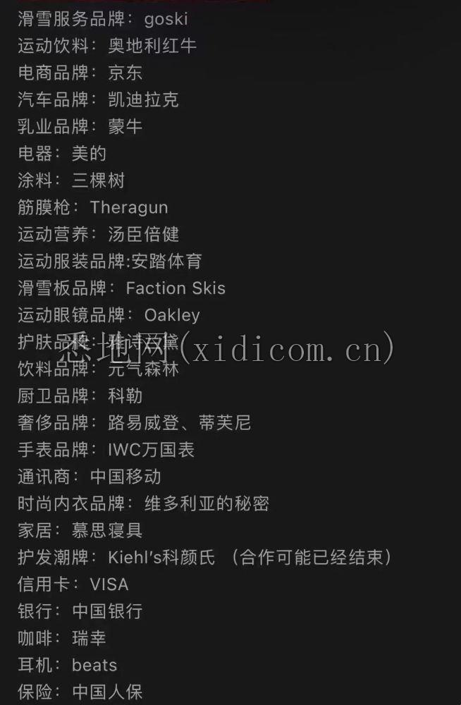 细数这位运动明星代言清单,能发现大量熟知的品牌,涵盖衣食住行几乎没有空缺,而且大都是她在这之前就已经定下的合作。在与滑雪的运动领域,也能看到运动饮料奥地利红牛、运动服装安踏、运动眼镜Oakley的合作,这之外还有个小众领域,定位运动康复设备的筋膜枪。