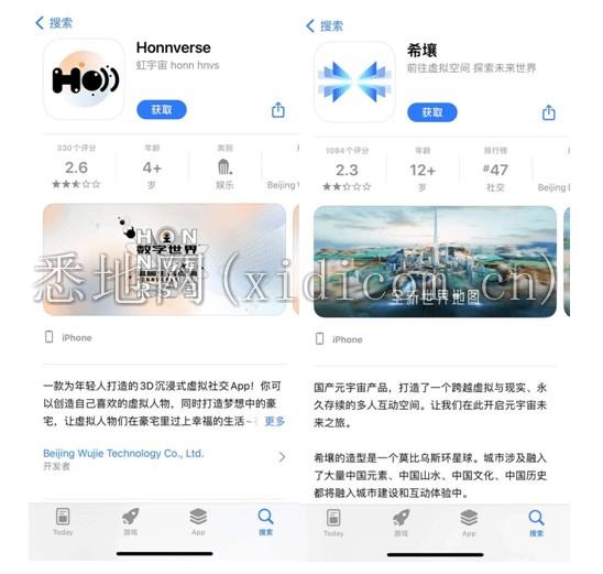 目前,国内两款已上线的元宇宙产品在苹果App Store上都反馈一般,百度的“希壤”评分2.3分,天下秀的“虹宇宙”为2.6分,未达用户预期。