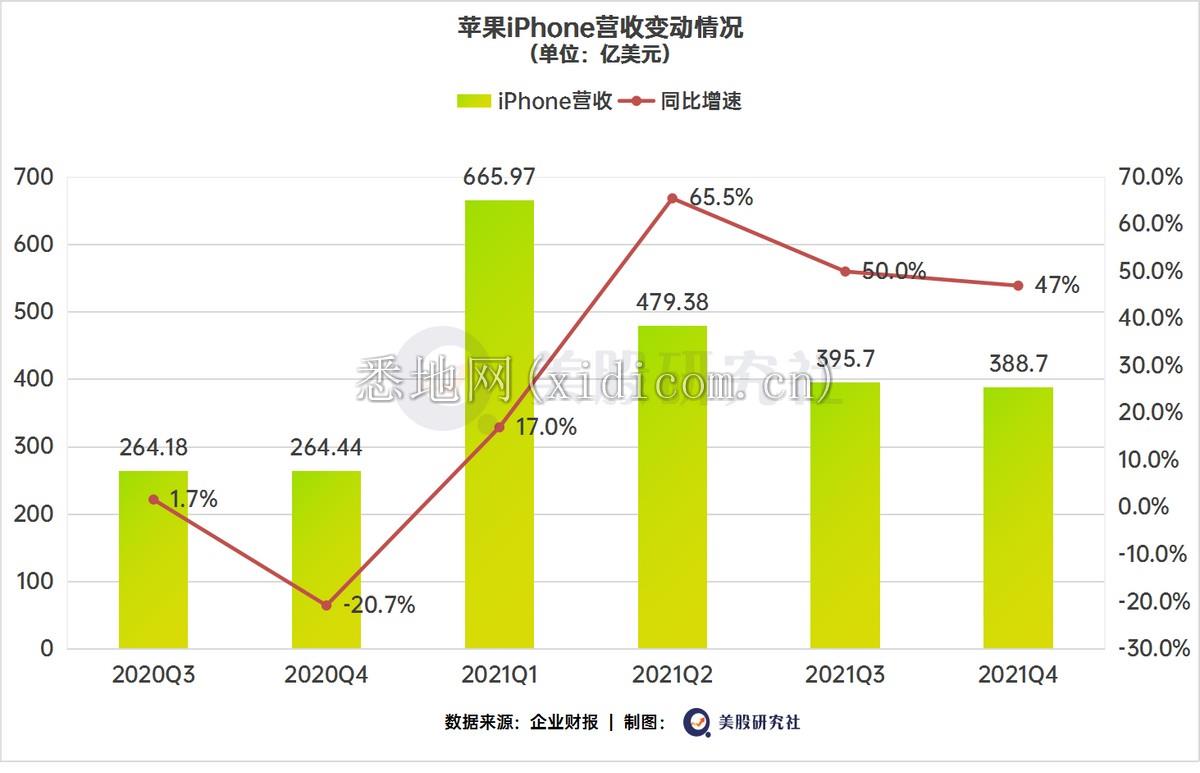 iPhone的销售罕见地没有超过分析师预期,2021财年Q4,苹果iPhone智能手机收入388.7 亿美元,同比增47%,但大幅低于市场预期的416亿美元。