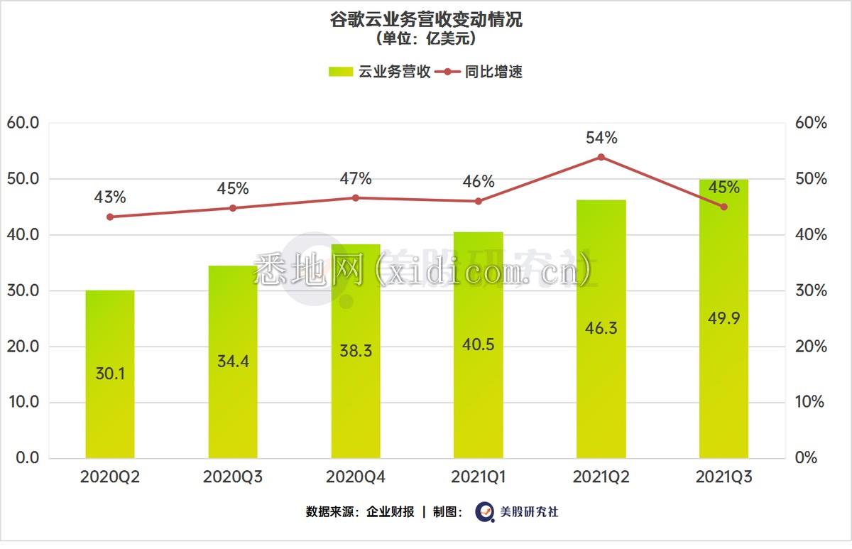 而在备受关注的云业务上,云业务三季度收入49.9亿美元,同比增45%,未达预期,增速也在放缓。但运营亏损6.44亿美元,远低于预期的亏损9.35亿美元,同比去年接近砍半。要知道,全球前三云计算厂商里,只有谷歌是不计成本地激进争抢大客户,亏损收窄意味着其云业务或许将迎来新的发展拐点。早在去年Q4,就有分析师预计谷歌云业务将要扭亏。