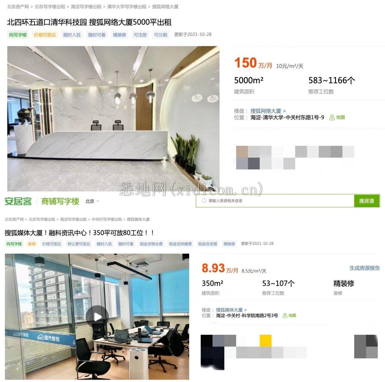 搜狐媒体大厦和搜狐网络大厦正在出租,图源安居客
