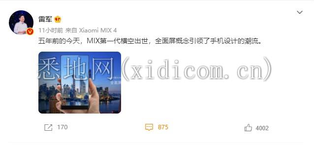 2016年10月25日,一款具有历史意义的手机正式发布,毫不夸张地说这款手机奠定了未来五年乃至十年的手机形态发展,它就是小米MIX。小米创办人、小米集团董事长兼CEO雷军也在今早发文表示:“五年前的今天,MIX第一代横空出世,全面屏概念引领了手机设计的潮流。”