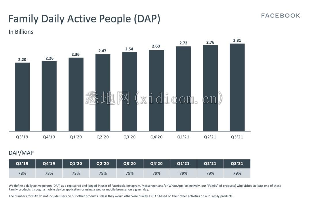 Facebook生态(包括Instagram、WhatsApp等其他应用)日活跃人数(DAP,Daily Active People)达28.1亿,同比增长11%,月活跃人数(MAP)达35.8亿,同比增长12%