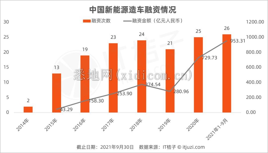 IT 桔子数据显示,截至 2021 年 9 月,中国境内以新能源汽车研发、生产制造为核心业务的新造车企业合计达到 103 家。从这批造车新势力的融资趋势来看,他们仿佛从未曾经历过寒冬,在资本寒冬、疫情笼罩、经济下行的 2020 到 2021,新造车势力的融资能力反而继续高涨。