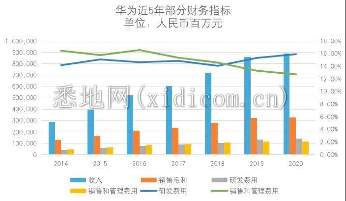 而华为一贯有重视研发的传统。自本世纪初经历了思科之战后,更加坚定了走自主研发道路的决心。据官方数据,截至2020年底,华为在全球共持有100,000+有效专利,90%以上专利为发明专利,近十年累计投入的研发费用超过人民币7,200亿元。其中,从事研究与开发的人员约10.5万名,约占公司总人数的53.4%。