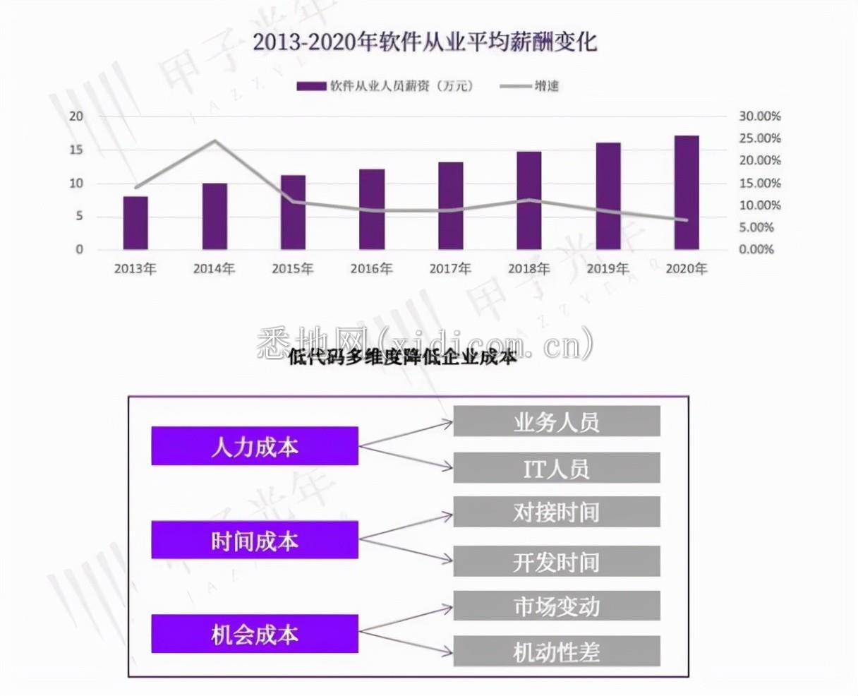 甲子光年发布的《低代码市场调研报告》(2021)指出,近几年IT开发人才支出不断走高,但相应的开发效率提升并没有明显进步,反倒是在时间、沟通等多方面成本增长。