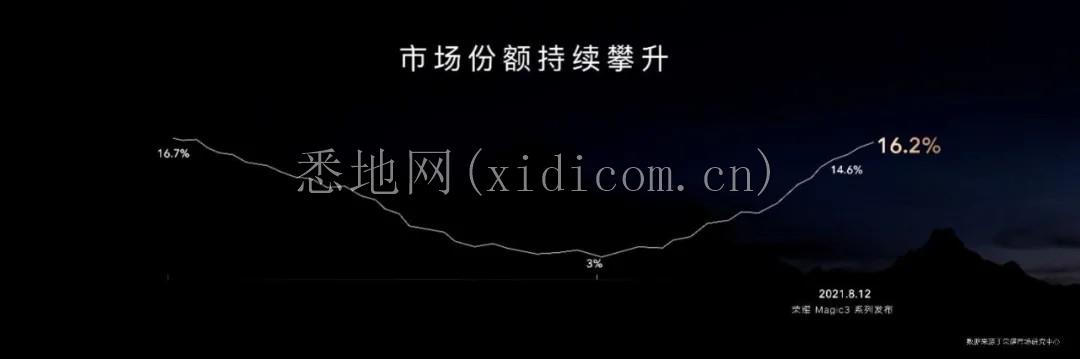 9月22日,荣耀CEO赵明在荣耀Magic 3系列影像技术发布会上透露,荣耀品牌市场份额升至16.2%,距离荣耀历史上的最高峰只差0.5个百分点。在此之前,荣耀市场份额最低曾跌至3%。