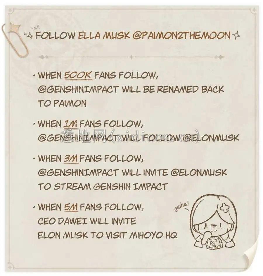 10月14日当天,官方为了庆祝《原神》推特粉丝超过200万人,还发起了一场社区挑战赛:当关注人数达到50万时,官方将ID改回派蒙“PAIMON”;当关注人数高达到100万时,官推将关注埃隆·马斯了的推特;当关注达到300万时,将邀请马斯克直播玩《原神》;当关注人数达到500万时,米哈游CEO大伟将邀请马斯克来上海参观米哈游总部。