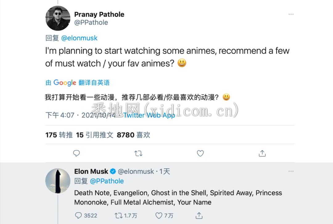 在安利《原神》的推特下,有网友让马斯克推荐几部动漫,马斯克也迅速回复《死亡笔记》、《新世纪福音战士》、《攻壳机动队》、《千与千寻》、《幽灵公主》、《钢之炼金术师》、《你的名字》,直接坐实二次元身份。