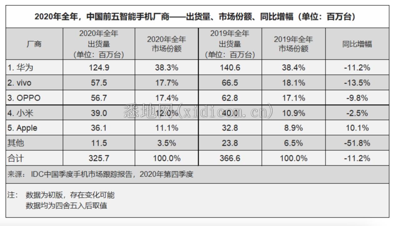 2020全年中国智能手机厂商数据,图源IDC