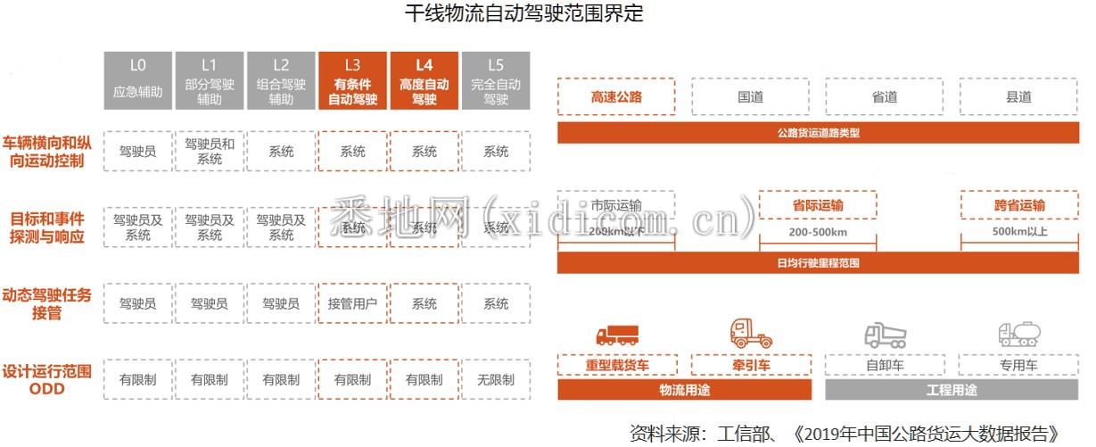 目前,自动驾驶干线物流赛道主要指以L3、L4级自动驾驶重卡为运载工具,运输线路以高速公路为主,日均行驶里程在200km以上的省际与跨省公路货运领域。