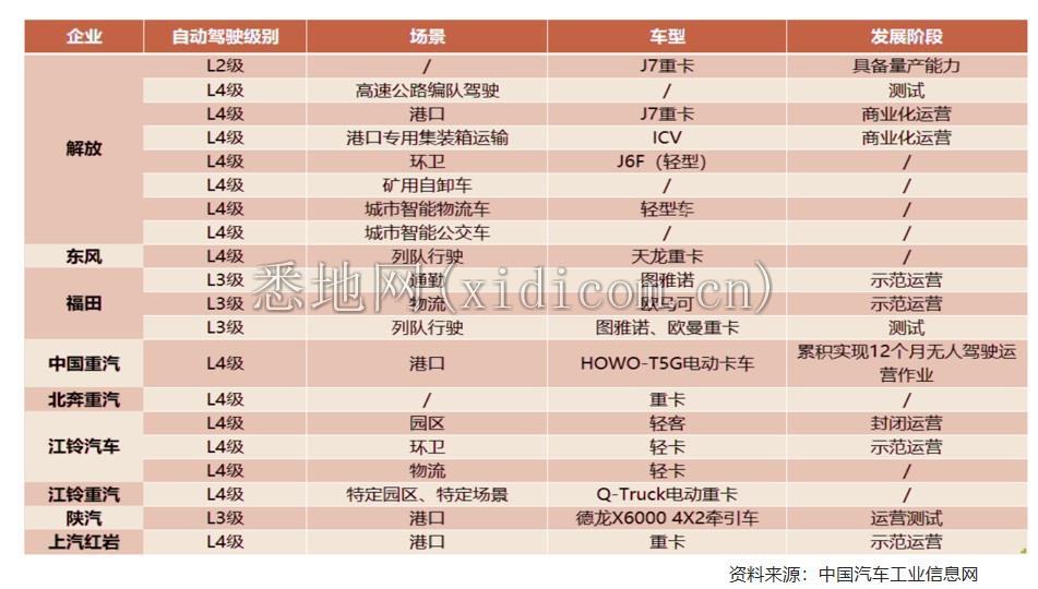 根据中国汽车工业信息网的统计,目前主要重卡企业生产的自动驾驶重卡当中,除少部分在港口场景中已实现量产并商业化运营之外,在干线物流场景,大部分仍处于测试阶段。