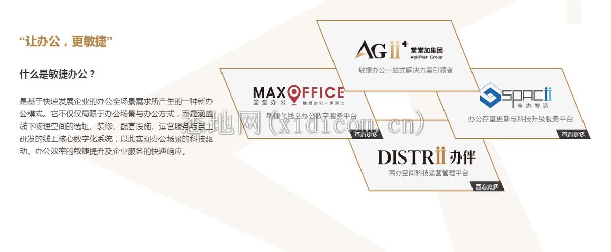 正是意识到这一点,在空间管理基础上,2021年6月,“Distrii办伴”正式升级为“AgiiPlus堂堂加”。MaxOffice堂堂办公(敏捷化线上办公数字服务平台)、Spacii全办智造(办公存量更新与科技升级服务平台)、Distrii办伴(商办空间科技运营管理平台)三大子业务随之明确。