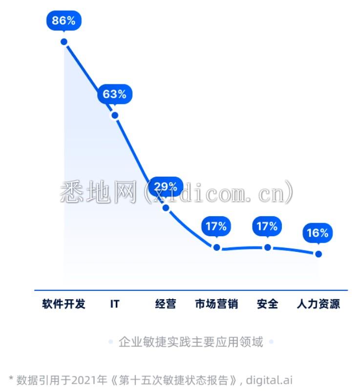 比如在敏捷领域上,86%的受访者认为所在企业的敏捷协作主要应用在软件开发,其他技术需求性稍弱的领域并没有大规模感受到敏捷协作带来的改观。