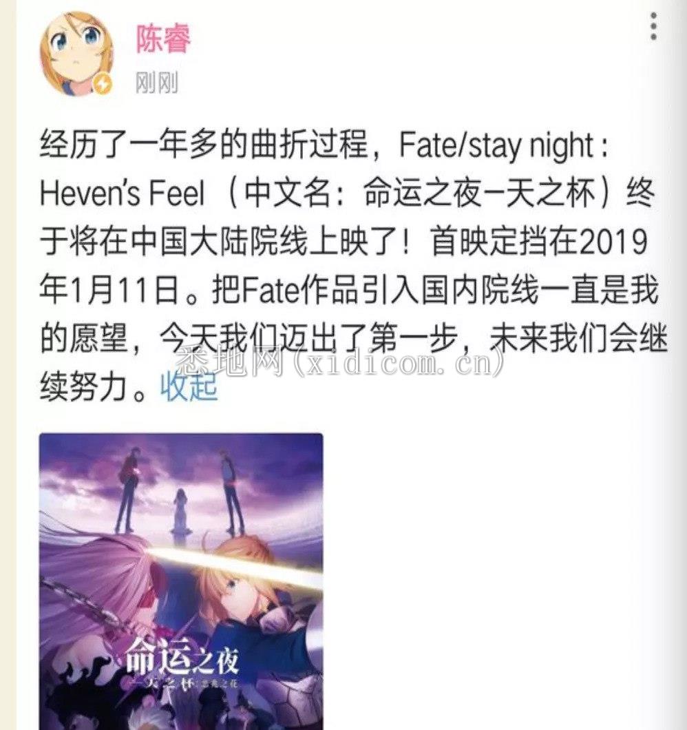 日本批片中还有一类最特殊的买家,他们本身就是动漫IP原著粉,粉丝心态左右了他们引进剧场版。前两年这样的买家,大多为昙花一现的个人玩家。而这一次大名鼎鼎的“B站”上海宽娱数码引进《命运之夜——天之杯:恶之花》情况却大不同,CEO陈睿发布了一份带有粉丝滤镜的公告,称引进“fate”一直是自己心愿。第一部票房不太理想情况下,毫不影响第二部引进进度,近日“B站”已放出即将上映的消息,这一次大大缩短了延期上映的时间,或许能扭转“fate”的市场表现。