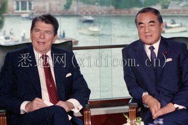 里根总统靠着椅背,翘起腿,凝视着远处的闪光灯露出得意的微笑;一旁的日本首相中曾根康弘则直起身子凑向里根,似笑非笑之间若有所思地低头扫视着地板。